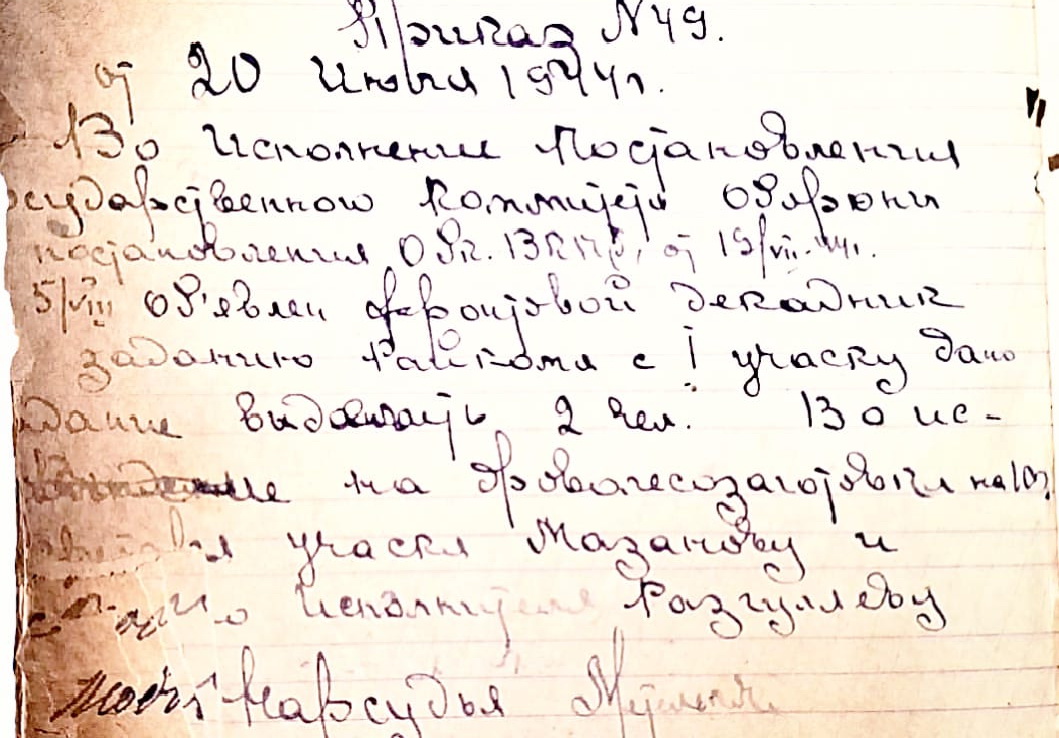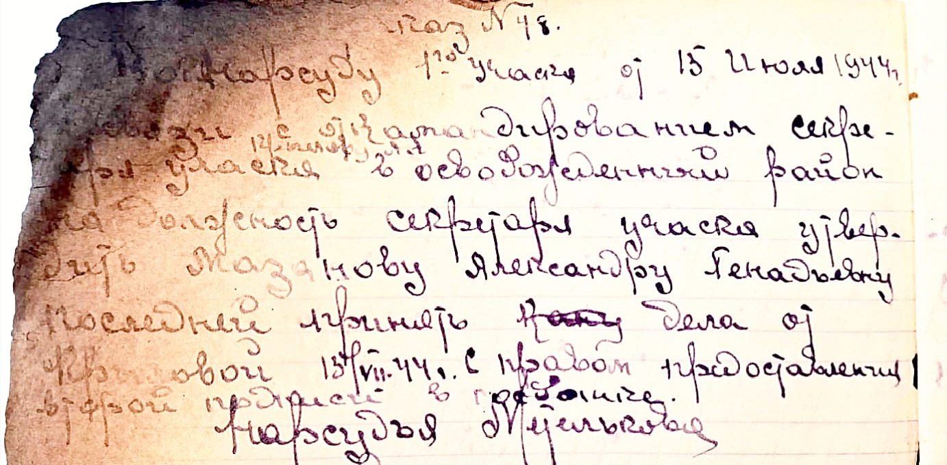 «В связи с откомандированием секретаря участка Крыловой Л.А. в освобожденный район на должность секретаря участка утвердить Мазанову А.Г., последней принять дела от Крыловой 13.07.44 г. с правом предоставления второй подписи в госбанке». Согласно приказа № 49 по народному суду 1-го участка г. Буя от 20 июля 1944 года был объявлен фронтовой декадник по заданию Буйского Райкома партии по дровозаготовкам, на который были выделены работники суда.